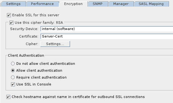 ldapX $ certutil -d /etc/dirsrv/slapd-<instance>/ -A -n "My Local CA" -t CT,, -a -i /path/to/root/certificate.crt # import root CA certificates.You have now imported the certificates. You now need to enable encrypted connections. This is easily done from 389-console.